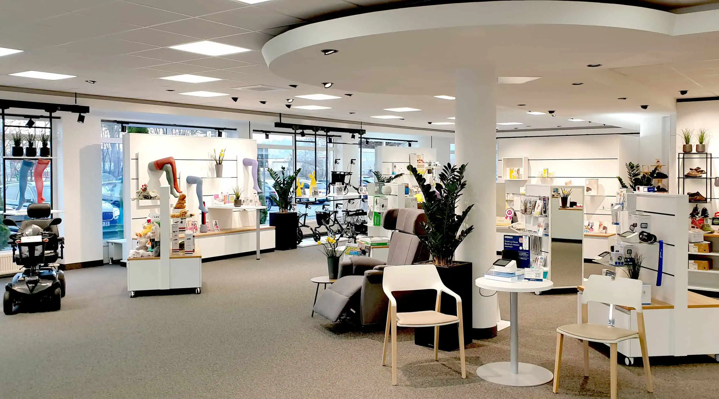 In eine bestehende Ladenfläche wurde mit viel Engagement und professioneller Planung eine neue Filiale konzipiert und realisiert. Wichtig für die Geschäftsführer war, dass hier nicht ausschließlich Produkte per Rezept abgegeben werden. Das Sanitätshaus sollte darüber hinaus das Signal an die Kunden senden, in eine Freiverkaufs- und Dienstleistungswelt einzutauchen, wenn sie die Ladenfläche betreten.