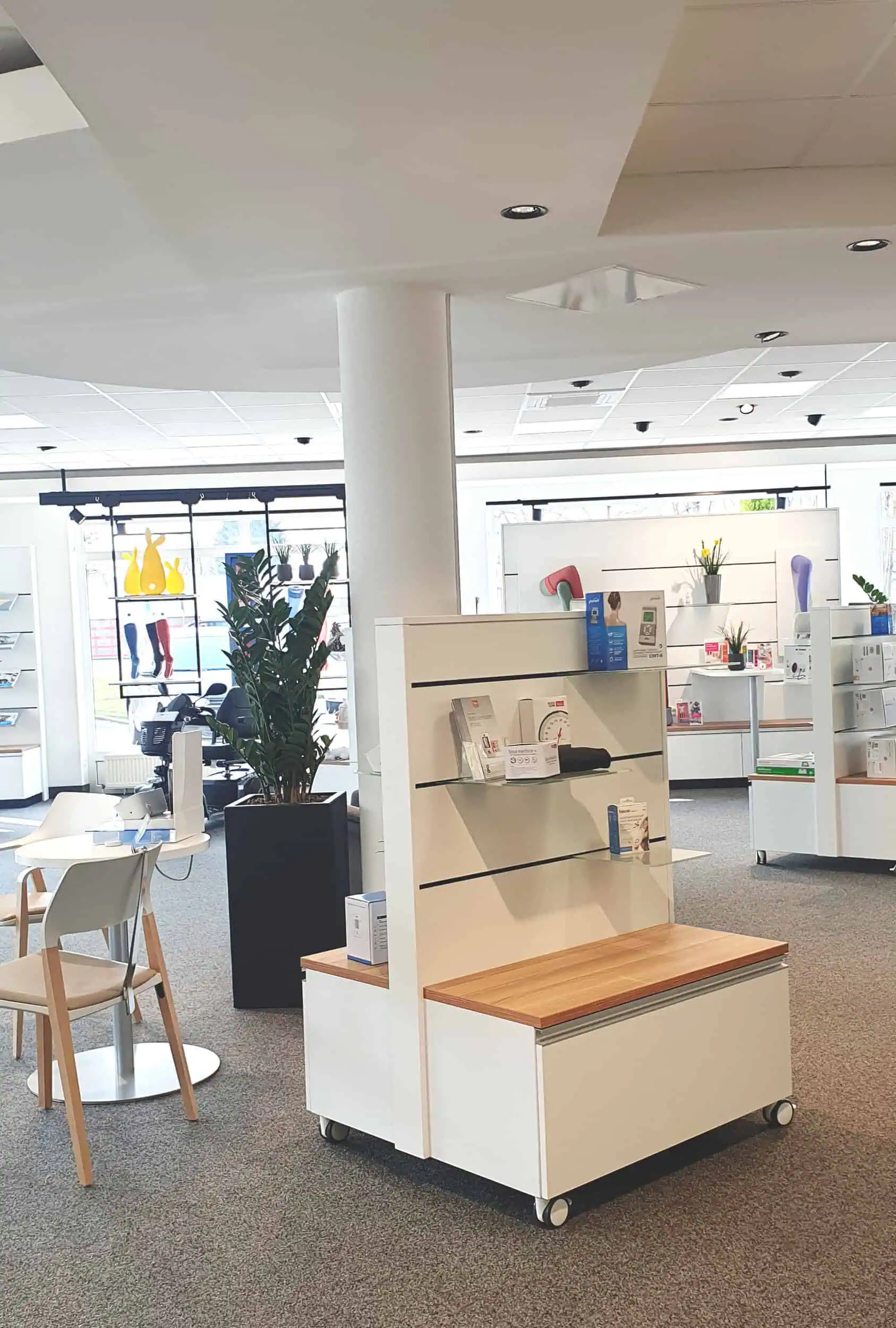 In eine bestehende Ladenfläche wurde mit viel Engagement und professioneller Planung eine neue Filiale konzipiert und realisiert. Wichtig für die Geschäftsführer war, dass hier nicht ausschließlich Produkte per Rezept abgegeben werden. Das Sanitätshaus sollte darüber hinaus das Signal an die Kunden senden, in eine Freiverkaufs- und Dienstleistungswelt einzutauchen, wenn sie die Ladenfläche betreten.